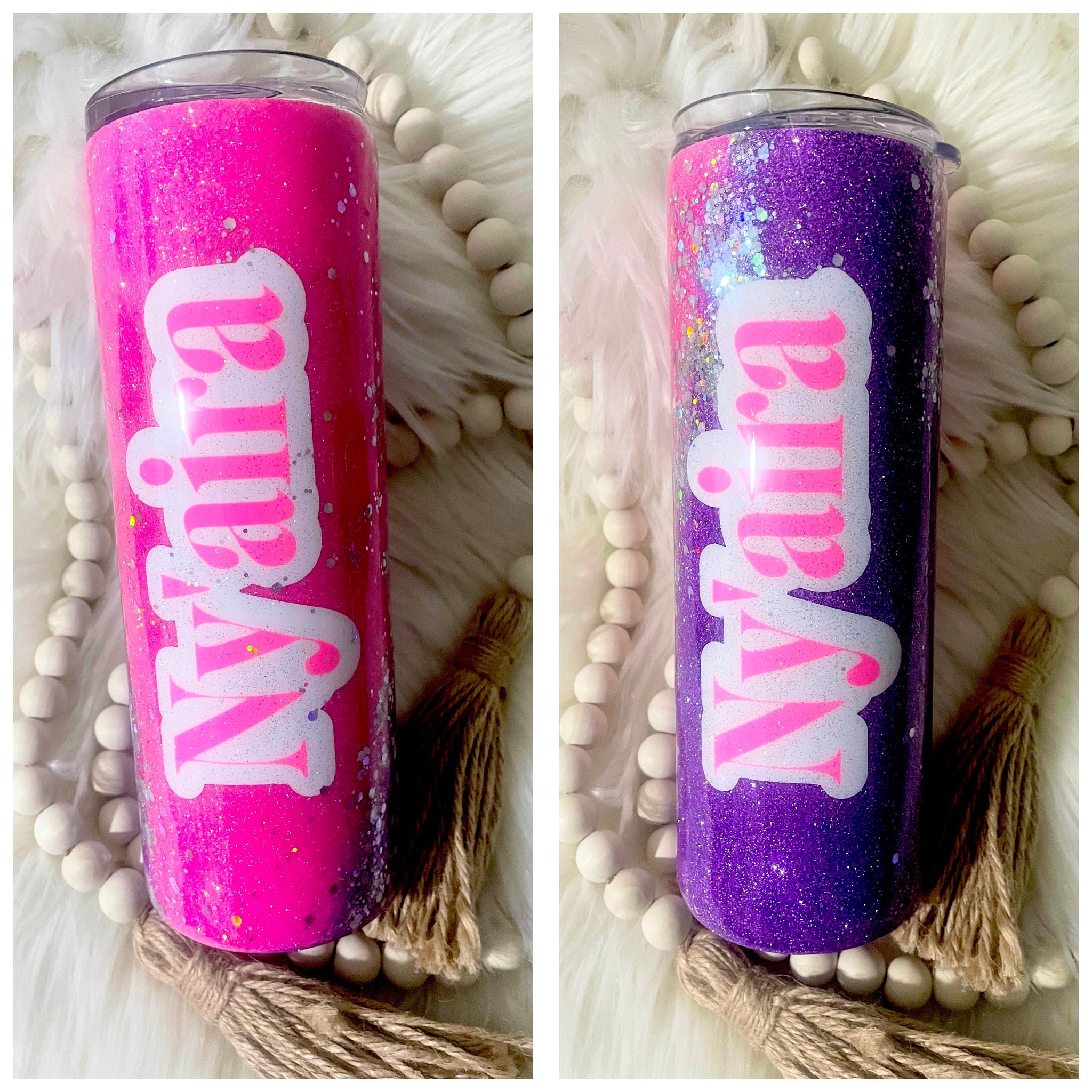 Design your own 20 oz stainless steel skinny tumbler with lid and straw. Select your desired glitter colors, text, and font to personalize it. Each tumbler is double wall vacuum insulated, keeping your drinks hot or cold. For an extra-smooth finish, every tumbler is coated with a food-safe sealant. Uniquely crafted, no two tumblers with appear identical - slight imperfections may be present in the clear sealant.